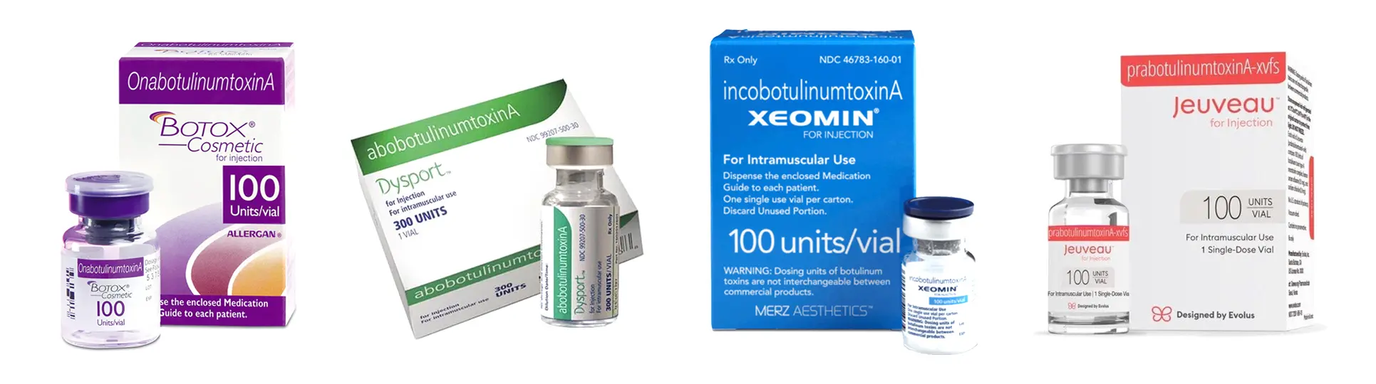 Botox, Dysport, Xeomin, Jeuveau are FDA-approved nonsurgical treatments for targeting active lines or age-associated wrinkles. These compounds are derived from botulinum toxin A, which temporarily weakens or paralyzes specific muscles underneath the skin. As a result, the weakened muscle does not contract as strongly and therefore the overlying skin wrinkles appears less prominently.